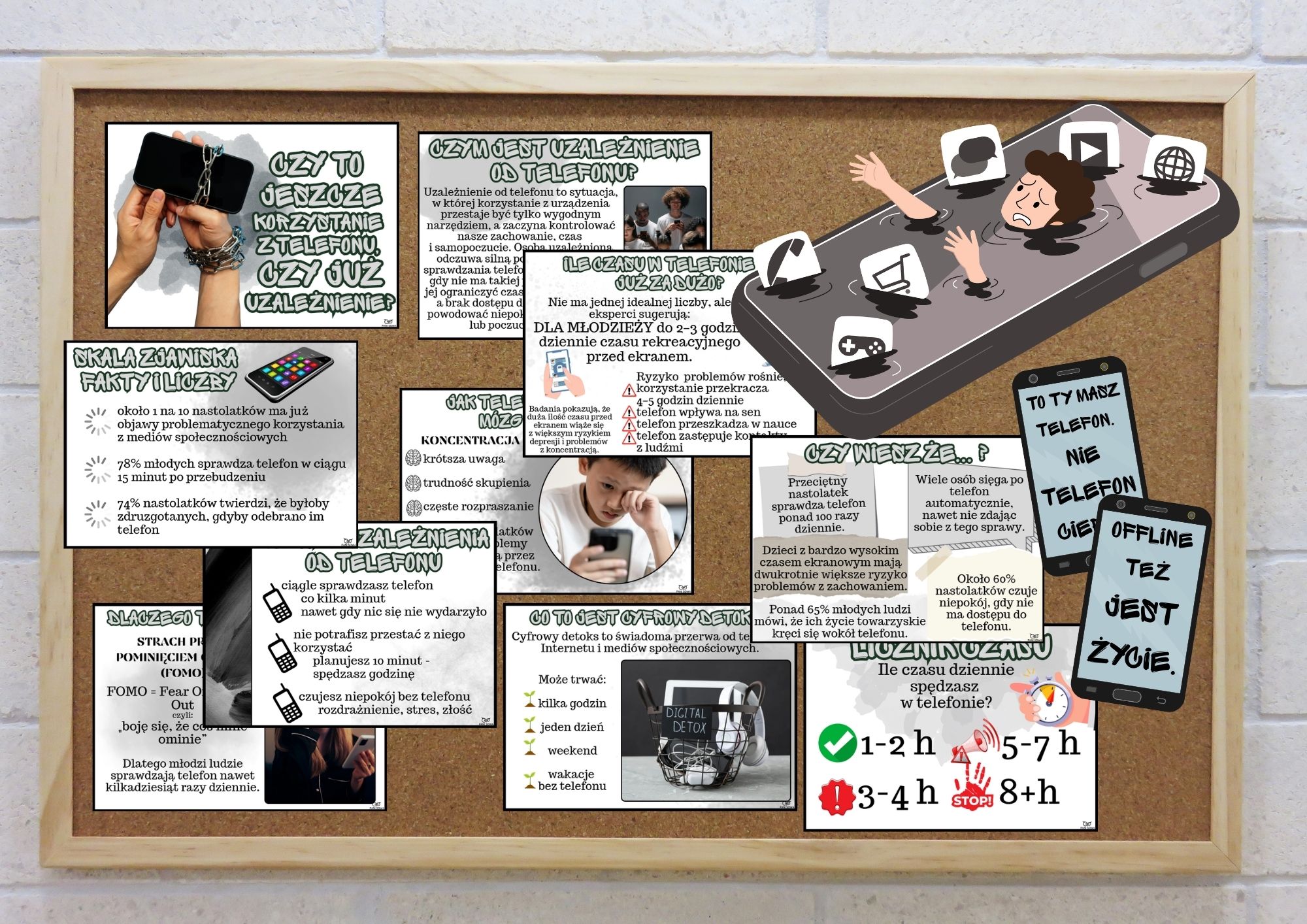 Smartfon towarzyszy uczniom niemal cały czas. Ta gazetka pomaga w prosty i czytelny sposób poruszyć z młodzieżą ważny temat – kiedy korzystanie z telefonu jest normalne, a kiedy zaczyna być problemem. Materiały pokazują fakty, ciekawostki, konsekwencje nadmiernego korzystania z telefonu oraz podpowiadają, jak zadbać o równowagę między światem online i offline. Idealna do wykorzystania na korytarzu szkolnym, w sali lekcyjnej, podczas zajęć wychowawczych lub w gabinecie pedagoga czy psychologa.